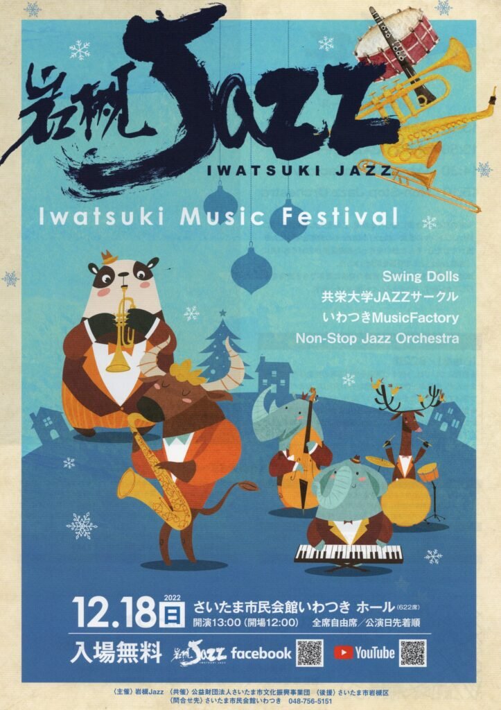 毎月第3土曜日に岩槻駅前で開催しているWATSUストリートマルシェの音楽ステージをはじめ岩槻区内外のイベントをプロデュース&出演などを行っています。Youtubeで岩槻Jazzの活動をみることが出来ます。